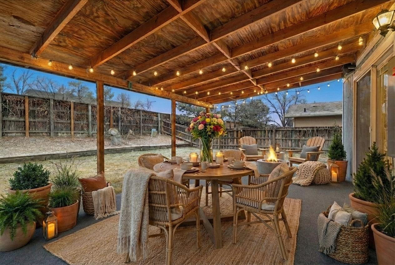 A covered outdoor patio for relaxing or entertaining.